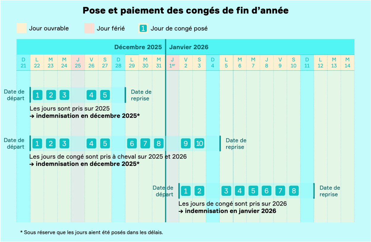 La pose des congés doit intervenir le plus tôt possible. C’est d’autant plus vrai pour les congés de fin d’année car des congés posés ou modifiés tardivement* exposent le salarié à voir le calcul de ses droits et son paiement retardés à la première quinzaine de janvier.