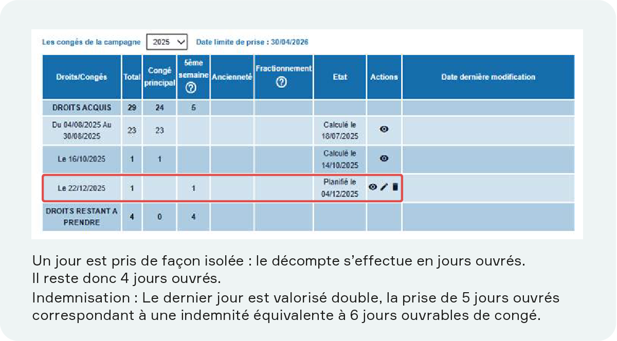 Exemple : si un salarié pose la semaine du 22 décembre avec un retour au travail le 5 janvier, 10 jours de congé lui seront décomptés et non 12, du fait de la présence de deux jours fériés (25 décembre 2025 et 1er janvier 2026).