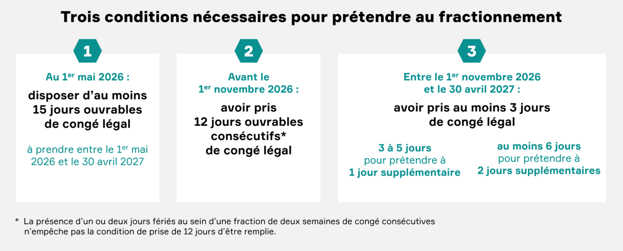 Le salarié peut prétendre à un ou deux jours supplémentaires de congé au titre du fractionnement, sous trois conditions cumulatives :